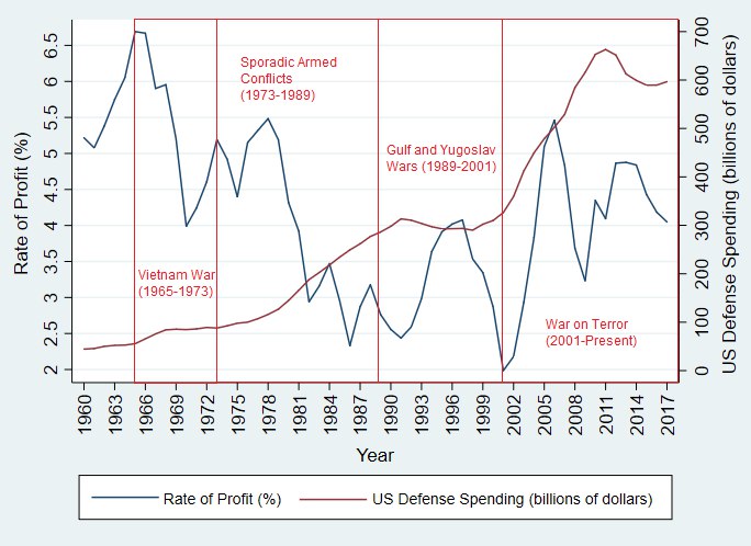 29 Strictly speaking, it is not possible to infer a causal relationship between US defense spending and the rate of profit from the regression on Table 4. Nevertheless, I ran a separate model which confirmed my earlier claims about imperialism. In the interest of simplicity, I have opted not to include a table of these results in the main text, but I do so here for our more quantitatively-inclined readers to peruse.