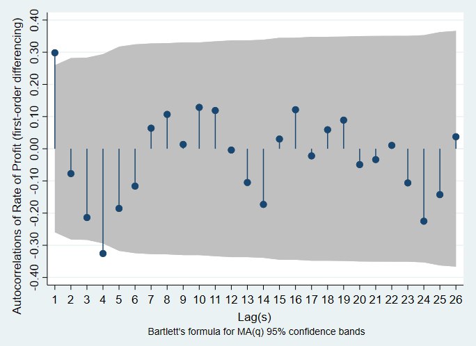 Figure A. Correlation and Partial Autocorrelation plots for the Rate of Profit with first-order differencing.